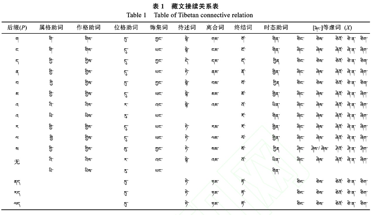 接續(xù)關(guān)系是傳統(tǒng)藏文文法的組成部分,也是1300 多年來一致沿用、藏文書寫必須遵守的規(guī)則。如果不按接續(xù)關(guān)系來書寫藏文,均視為接續(xù)錯誤。接續(xù)關(guān)系如表 1 所示, 該表是根據(jù)藏文文法收集和整理的藏文接續(xù)關(guān)系表。