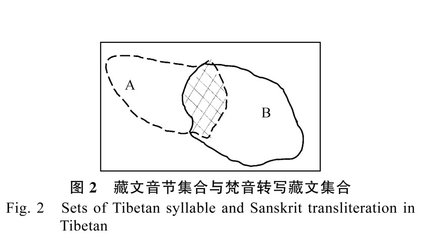 藏文文本中一般會出現(xiàn)傳統(tǒng)文法規(guī)則形成的藏文音節(jié)和梵音轉(zhuǎn)寫藏文。從表現(xiàn)形式上看,兩種字符串都是由音節(jié)點來隔開。在拼寫檢查時,不能用同一種規(guī)則方法來檢查拼寫的正確性。針對這個問題,首先需要明確藏文音節(jié)字符集合和梵音轉(zhuǎn)寫藏文字符集合的關(guān)系。由于傳統(tǒng)藏文文法和梵音轉(zhuǎn)寫藏文具有不同的文法體系,因此是兩個不同的字符組合關(guān)系。但畢竟這兩個集合是共同字符的兩種不同組合形式,所以兩個字符集合是一個大的集合中的不同子集,它們之間存在交集的部分,兩個集合關(guān)系如圖 2 所示,其中 A 是正確的藏文音節(jié)集合,B是正確的梵音轉(zhuǎn)寫藏文集合; A 和 B 的交集是共同擁有的正確的部分,圖中用交叉斜線部分表示;A∪B 的補集是藏文文本中字符組合錯誤的部分。