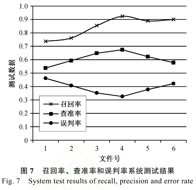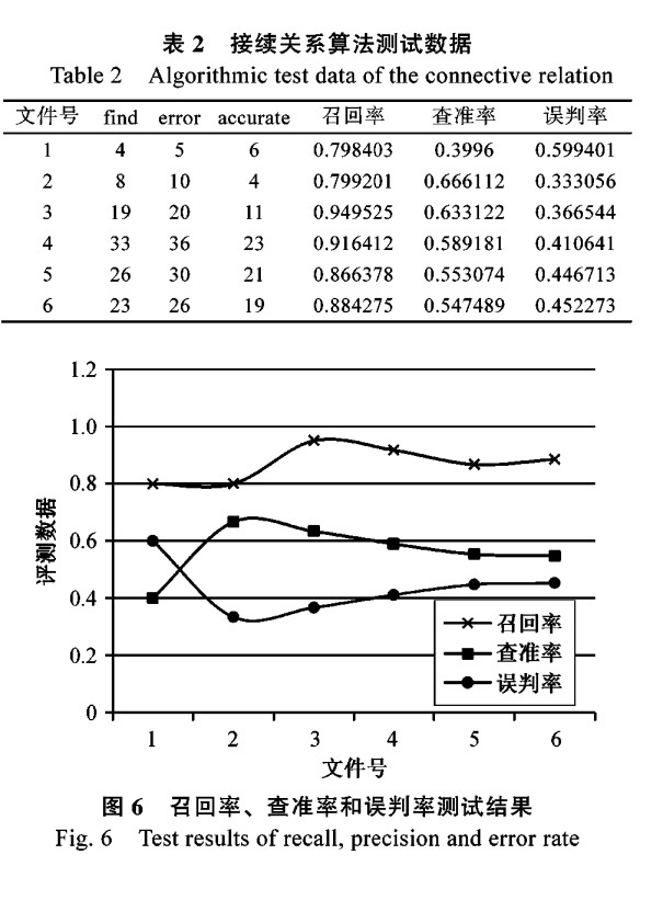 測試內(nèi)容包含接續(xù)關(guān)系檢查算法和系統(tǒng)部分的測試,主要檢查正確率、召回率和誤判率,并分析每個過程的測試結(jié)果。下面對幾個測試標準在文本中使用的方法做簡要介紹,然后分析實驗的測試結(jié)果。