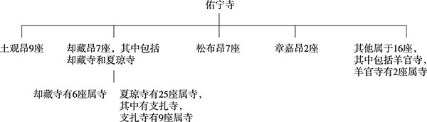 屬于二級層級結構模式的主屬寺系統(tǒng),在青海境內還有:蓮花臺屬寺系統(tǒng)、龍合寺(塘爾恒寺)主屬寺系統(tǒng)、弘善寺主屬寺系統(tǒng)、卡地喀寺主屬寺系統(tǒng)、才旦寺主屬寺系統(tǒng)、文家寺主屬寺系統(tǒng)、瞿曇寺主屬寺系統(tǒng)、羊官寺主屬寺系統(tǒng)、文都寺主屬寺系統(tǒng)、古雷寺主屬寺系統(tǒng)、俄合薩寺主屬寺系統(tǒng)、隆務寺主屬寺系統(tǒng)、拉莫德千寺主屬寺系統(tǒng)等等。