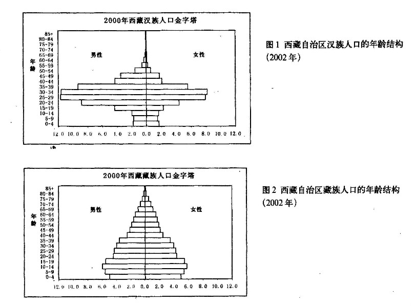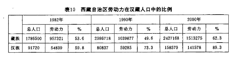 2.1982年漢族人口的文盲、半文盲只有6.8%,2000年僅有3.2%,而2000年全國的文盲率為9.5%。這樣,從“紡錘形”的年齡結(jié)構(gòu)、高就業(yè)率和反常的低文盲率這三個角度都說明了西藏自治區(qū)的漢族人口是一個特殊的“工作人口”。
