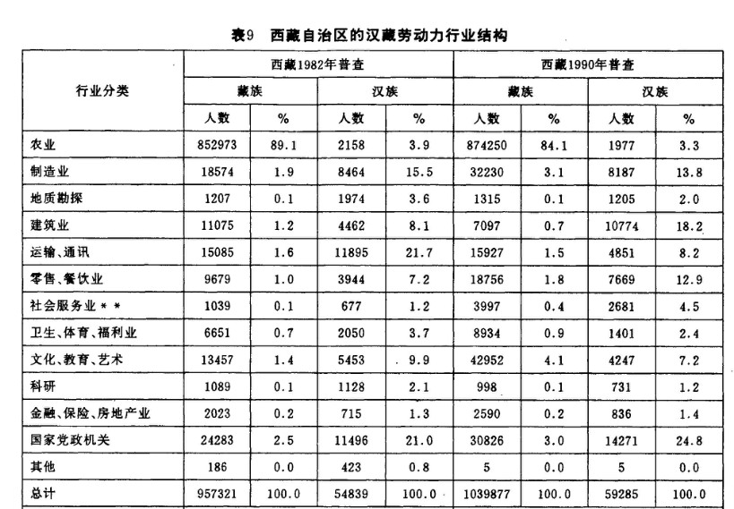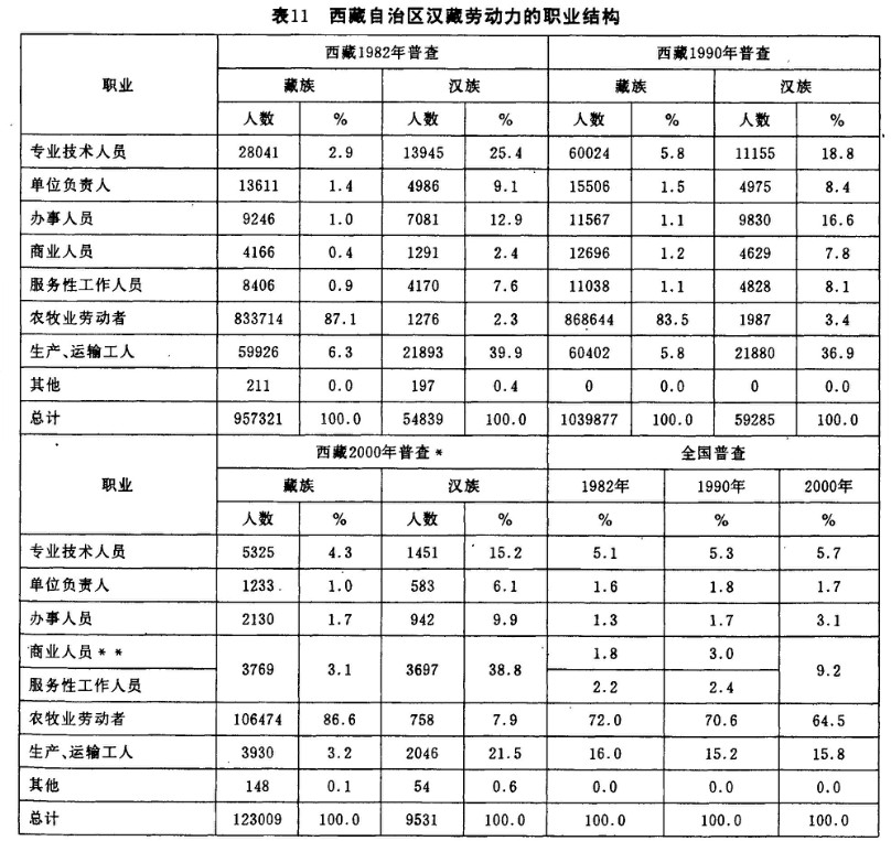 1.1982—1990年期間,藏族的“專業(yè)技術(shù)人員”人數(shù)增加了兩倍多,在藏族總勞動力中的比例也增加了兩倍。與之相比,漢族“專業(yè)技術(shù)人員”人數(shù)有所減少,在漢族勞動力中的比例從25.4%下降到18.8%。同期漢族官員(“單位負責(zé)人”)的比例雖然下降了0.7%,但絕對數(shù)量變化不大。同期漢族“辦事人員”增加了2749人,所以漢族在“黨政機關(guān)”行業(yè)中人數(shù)的增加主要是辦公室的辦事人員,而不是負責(zé)的官員。同期藏族官員增加了1895人(14%),藏族“辦事人員”增加了2321人。這一時期是藏族干部和知識分子數(shù)量增加比較顯著的時期。