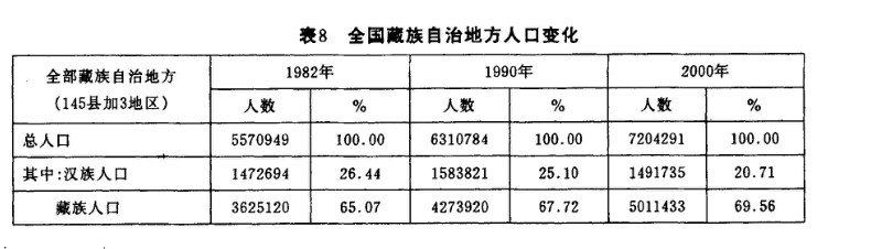 (2)漢族人口在1982—1990年期間增加了11.1萬人,在1990—2000年期間減少9.2萬人,18年中的年均增長率為0.07%。在藏族自治地方總?cè)丝谥兴急壤龔?6.4%下降到20.7%。