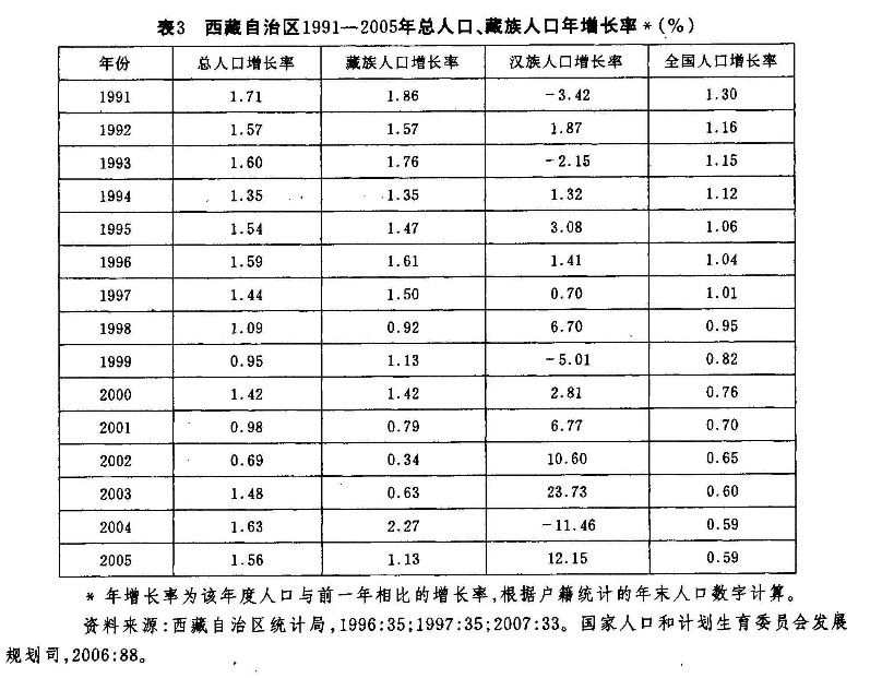 與之相比,在西藏自治區(qū)居住的漢族人口的年增長率則大起大落,1991年和1993年為負增長,1998年又出現(xiàn)了6.7%的高增長率,1999年再次出現(xiàn)明顯的負增長,2002—2003年大幅增加,2004年又有所回落,2005年再次增加。這說明在西藏自治區(qū)的漢族人口,是一個十分特殊的人口群體,其人口規(guī)模的大小,受到了中央政府不同年度經(jīng)濟發(fā)展政策和遷移控制政策的明顯影響。