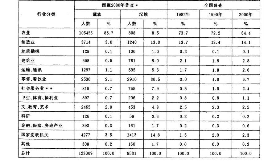 2.1990—2000年期間漢族和藏族專業(yè)技術(shù)人員的比重都有所下降,但是漢族技術(shù)人員的比重(15.2%)仍然大大高于全國的比例(5.7%)。同時2000年漢族和藏族的生產(chǎn)、運輸工人的比例都明顯低于1990年,漢族從36.9%下降到21.5%,藏族從5.8%下降到3.2%,說明西藏制造業(yè)和第二產(chǎn)業(yè)的萎縮。