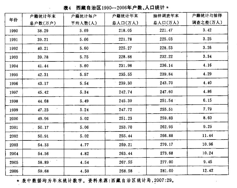 在1964年和1982年兩次人口普查得到的西藏自治區(qū)總?cè)丝跀?shù)分別是125.12萬人和186.36萬人,比同年戶籍登記的人口數(shù)(134.67萬人和189.25萬人)分別少了9.55萬人和2.89萬人。這兩次人口普查數(shù)字低于戶籍統(tǒng)計數(shù)字,表示普查的涵蓋面還沒有達到人口稀少的牧區(qū)。1982年普查的涵蓋面比起1964年已有明顯改善。自1990年普查及以后的人口抽樣調(diào)查所得到的人口數(shù)字,都高于戶籍統(tǒng)計數(shù)字,這說明普查已經(jīng)涵蓋了戶籍統(tǒng)計沒有包括的暫住人口。從表4來看,普查—抽樣調(diào)查數(shù)字一直在穩(wěn)步上升,雖然2002—2005年期間有小幅下降,到了2006年又顯著上升。