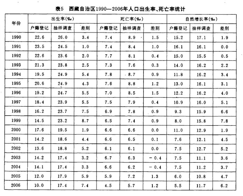 表5是戶籍登記的生育、死亡數(shù)字和抽樣調(diào)查結(jié)果之間的比較。戶籍管理部門登記的生育數(shù)字明顯低于抽樣調(diào)查得到的生育數(shù)字,從1991年的1.0 ‰增加到2006年的7.4 ‰,不斷出現(xiàn)波動。在生育率統(tǒng)計方面的差別,使我們對抽樣調(diào)查的對象是否嚴(yán)格限制為戶籍統(tǒng)計意義上的“常住人口”產(chǎn)生疑問。由于調(diào)查實施的條件,抽樣調(diào)查的地點很可能以城鎮(zhèn)為主,而西藏城鎮(zhèn)居民的生育率應(yīng)當(dāng)明顯低于農(nóng)村和牧區(qū)的居民。而表5中反映出的抽樣調(diào)查結(jié)果是生育率大大高于戶籍登記,這是與人們通常的看法相矛盾的。