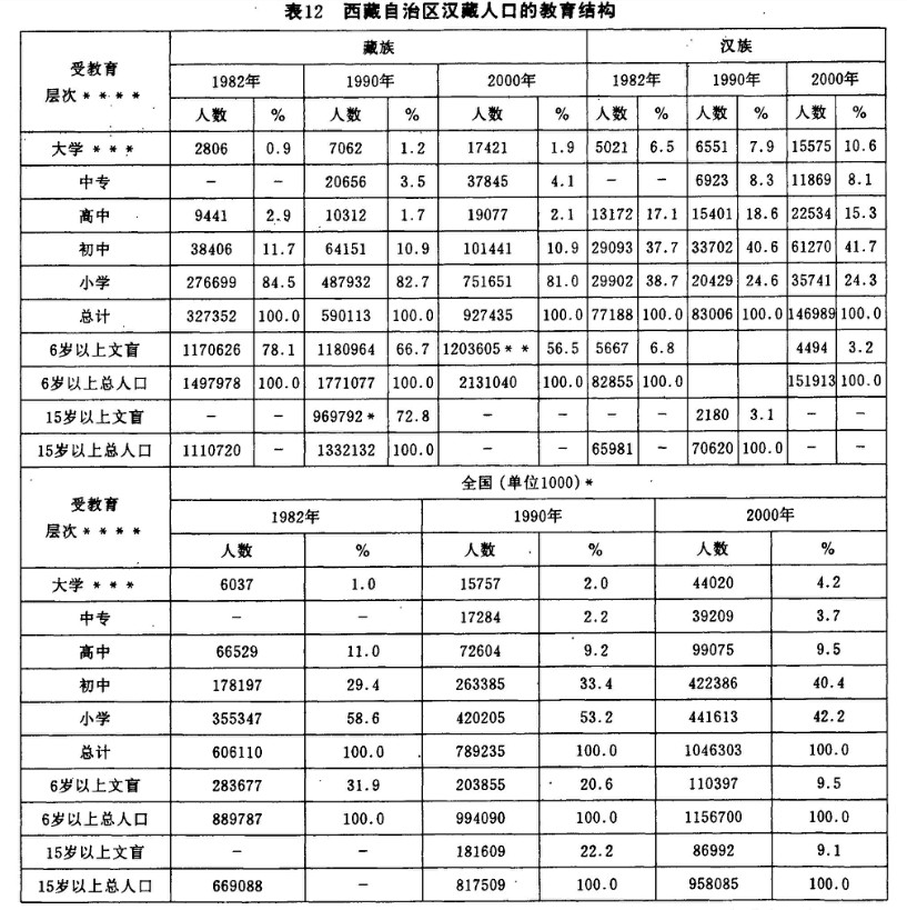 1982年在取得一定“文化程度”的藏族人口中,大學(xué)畢業(yè)、肄業(yè)和在校生總共只占0.9%,高中畢業(yè)生只占受教育人數(shù)的2.9%,初中畢業(yè)生占11.7%,小學(xué)占84.5%。全國平均水平是:大學(xué)占1.0%,高中11.0%,初中29.4%,小學(xué)58.6%。2000年與1982年和1990年相比,比例和規(guī)模提高最明顯的是大學(xué)生,從2806人增加到17241人,比例從0.9%提高到1.9%。其他各級學(xué)校畢業(yè)生的數(shù)量都有明顯提高。特別是在1982沒有統(tǒng)計的“中專生”,其比例在2000年在所有受教育的人口中達到4.1%。