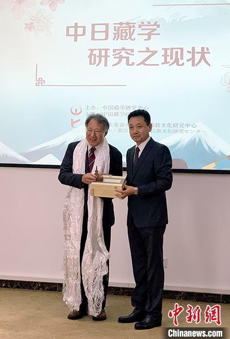 圖為中國藏學(xué)研究中心總干事、研究員鄭堆(右)在開幕式上向龍谷大學(xué)贈送電子版藏文《大藏經(jīng)》,受贈者為日方代表能仁正顯教授。中新社記者李晗雪攝