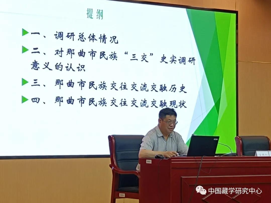 匯報(bào)會(huì)上,馮智研究員介紹了此次調(diào)研的總體情況,談了對開展各民族交往交流交融史實(shí)進(jìn)行研究的重要意義的認(rèn)識(shí),系統(tǒng)梳理了西藏那曲市各民族交往交流交融的歷史與現(xiàn)狀、趨勢與特點(diǎn),展示了調(diào)研組挖掘、整理的珍貴歷史檔案資料,充分說明了各民族交往交流交融是中華民族的本質(zhì)特征,是推動(dòng)形成中華民族多元一體格局的必然結(jié)果。自遠(yuǎn)古以來,生活在青藏高原的藏族和其他民族的祖先,就與祖國內(nèi)地建立了廣泛的聯(lián)系,為中華民族命運(yùn)共同體的形成與發(fā)展作出了重要貢獻(xiàn)。調(diào)研組認(rèn)為,西藏那曲市民族交往交流交融的歷史文化、紅色資源、名勝古跡等資源豐富,研究價(jià)值大,具有重要的現(xiàn)實(shí)意義,值得長期深入研究。