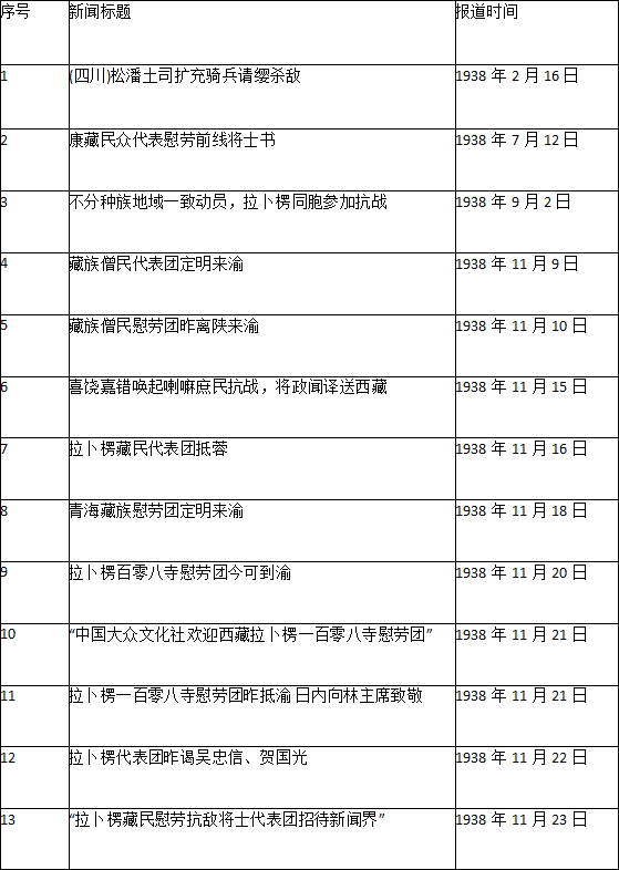 《新華日報》自1938年創(chuàng)刊至1944年,共計刊載了44篇有關(guān)藏族的新聞報道,其中絕大多數(shù)報道內(nèi)容都與藏族官民積極響應(yīng)全民抗戰(zhàn)號召相關(guān),表現(xiàn)了藏族僧俗群眾上下一心,身體力行,或請纓奔赴前線,或施以物質(zhì)援助,或付諸精神祈禱,雖身處邊陲后方,但心系抗戰(zhàn)前線的愛國情懷。