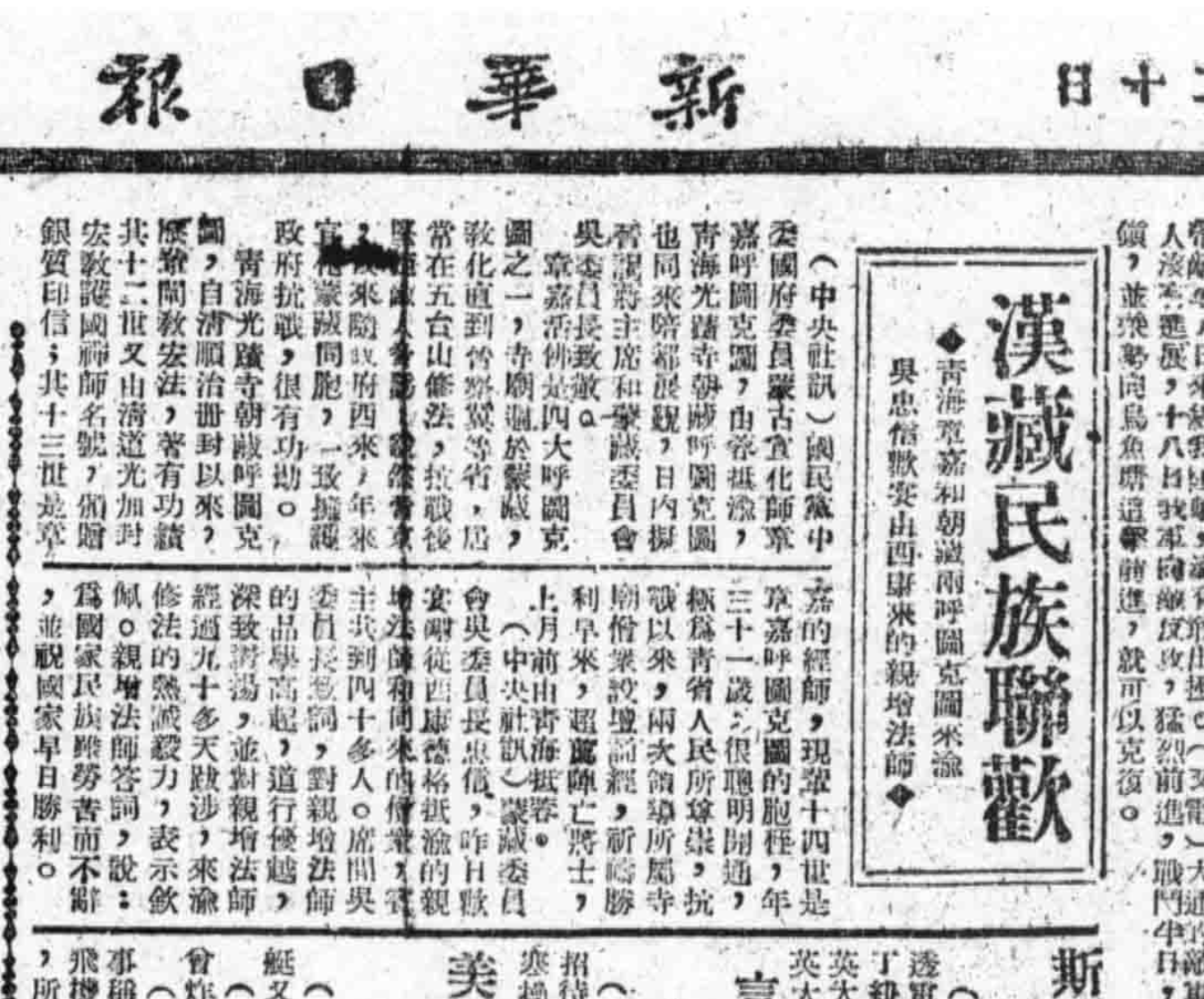 漢藏民族聯(lián)歡——青海章嘉和朝藏兩呼圖克來(lái)諭,吳忠信歡宴由西康來(lái)的親增法師(《新華日?qǐng)?bào)》1944年4月20日)