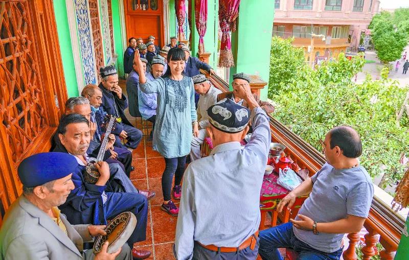 ▲在新疆喀什古城景區(qū)的“百年茶館”,游客和當(dāng)?shù)夭杩鸵黄鹞璧?。趙戈攝