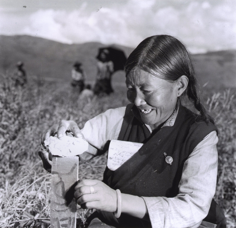 拉加里縣拉加里鄉(xiāng)的農(nóng)協(xié)會副主任委員洛桑卓瑪,在新分到的土地上釘標(biāo)記。