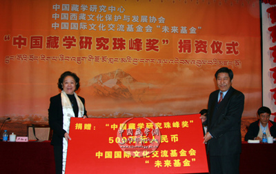 中國藏學研究珠峰獎捐資儀式上中國國際文化交流基金會理事盧紅生將捐贈牌匾贈與藏研中心