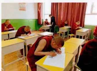 (中國(guó)藏語(yǔ)系高級(jí)佛學(xué)院招生考試現(xiàn)場(chǎng),僧人在進(jìn)行文化課考試。普布頓珠攝)