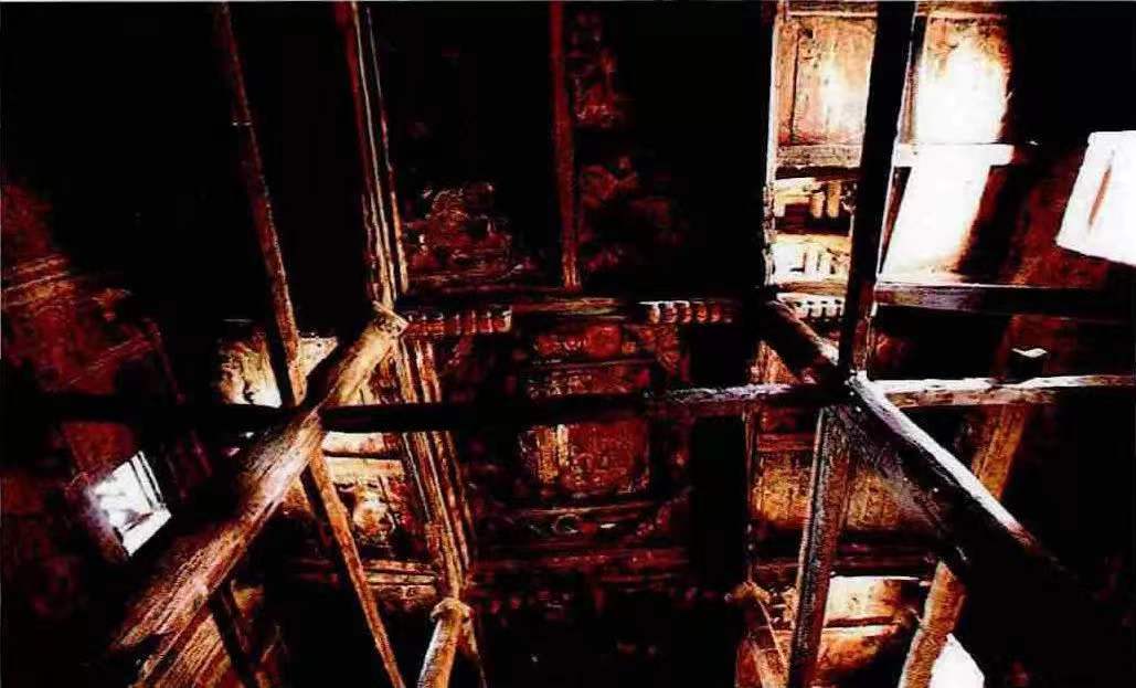從單體建筑來看,夏魯寺擴(kuò)建時期最上層的東西南北四個無量宮都采用了幾乎純?nèi)粷h式的大木構(gòu)做法,包括柱上、柱間和轉(zhuǎn)角斗栱結(jié)構(gòu)組成的鋪作層、彩繪的平棊頂,上覆綠色琉璃瓦、以椽栿承托的懸山屋頂?shù)?,都與已知的元代建筑做法十分相似,屬于元代時期的官式做法。此殿具備后弘初期桑耶寺式形制的典型特征,即中心佛堂環(huán)以轉(zhuǎn)經(jīng)廊的形式。在這樣的藏式佛堂結(jié)構(gòu)之上,將漢式大木構(gòu)建筑加以整合時,漢族匠師一方面不用立柱承托屋頂?shù)淖龇?,而是以周圈砌墻承重,在其上架設(shè)普拍枋承托上面的斗栱層和整個五槫歇山屋頂;另一方面運(yùn)用了宋代《營造法式》中“副階周匝”的做法,即在外檐柱外一周再增加一圈廊柱,并將廊柱間完全砌實構(gòu)成封閉空間。由此“副階”部分就構(gòu)成了圍合的轉(zhuǎn)經(jīng)廊,而在外觀上也形成了重檐歇山頂建筑。這種樣式可以稱為漢藏結(jié)合式大木構(gòu)佛堂。今日我們在藏地所能見到的這種形制的佛堂建筑,最早的實例就是夏魯寺東無量宮。夏魯寺的這種建筑模式在14世紀(jì)的衛(wèi)藏地區(qū)影響甚廣,如著名的噶當(dāng)派古寺卓瑪拉康即采用和夏魯寺一樣的漢藏結(jié)合式對佛堂進(jìn)行了重修。而至15世紀(jì)以后,藏地雖然未能將復(fù)雜的“平槫——椽栿”木作技術(shù)繼承下來,然僅就漢式坡面屋頂(rgya phibs)這種建筑外觀樣式而言,漢地歇山式金頂(gser gyi rgya phibs)在藏地已逐漸流行開來,最終成為整個雪域高等級佛教建筑的一種標(biāo)準(zhǔn)配置。
