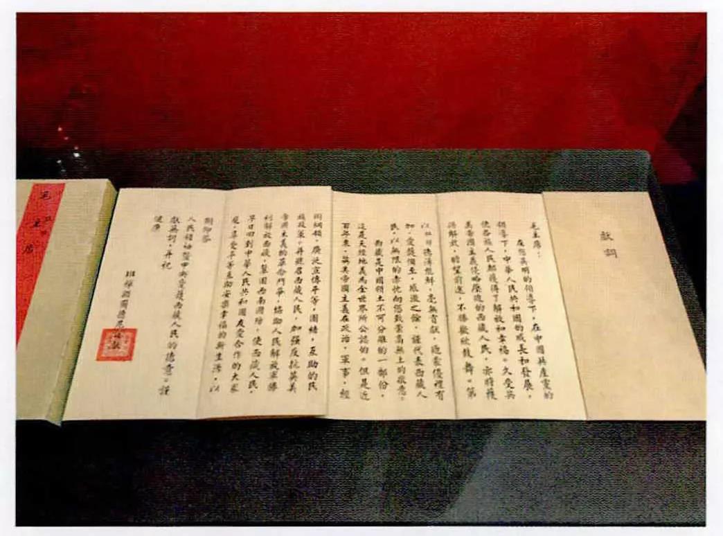 (十世班禪給毛主席的獻(xiàn)詞。楚翹攝于民族文化宮展覽館)