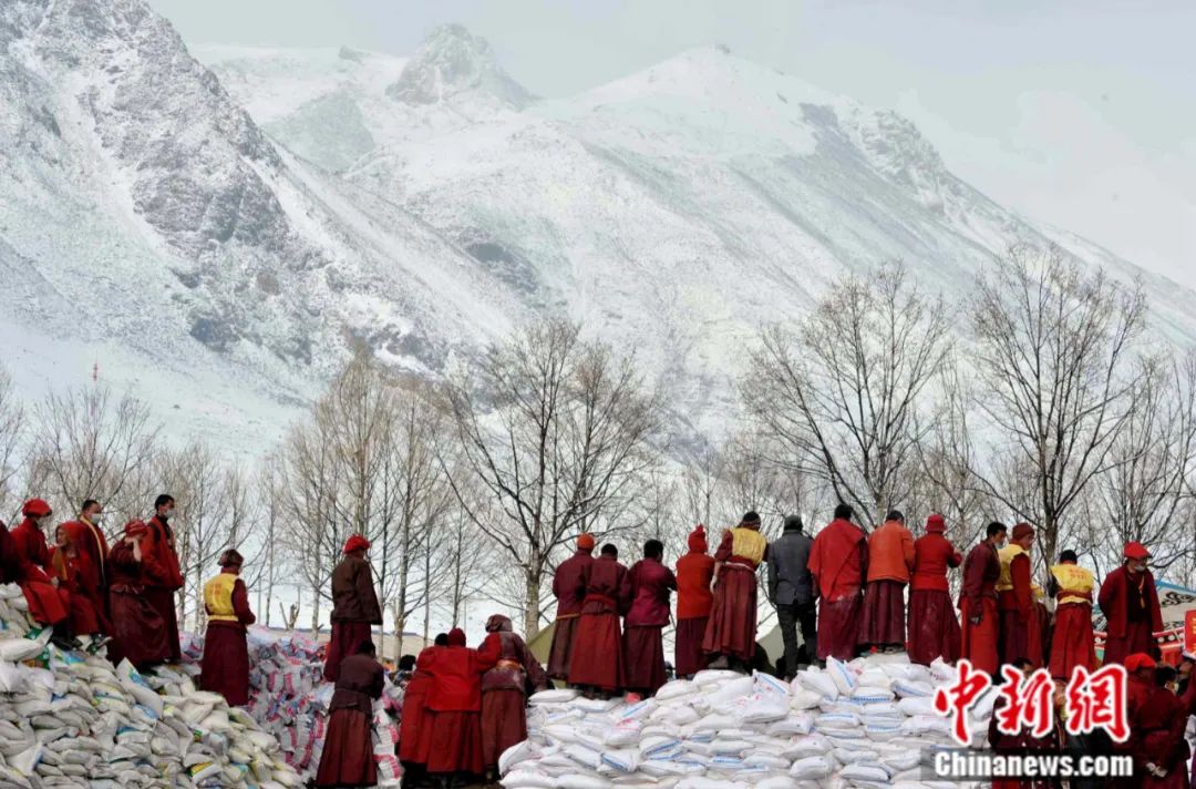 (2010年4月,青海玉樹地震期間,由宗教界捐贈的大批食品運(yùn)抵災(zāi)區(qū)。中新社記者賈國榮攝)