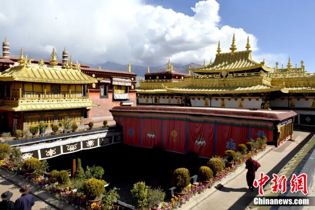 2014年10月拍攝的大昭寺金頂。大昭寺是西藏重大佛事活動的中心,“噶廈”政府的機構(gòu)設于寺內(nèi)。許多重大的政治、宗教活動,如“金瓶掣簽”等都在這里進行。中新社記者 李林攝