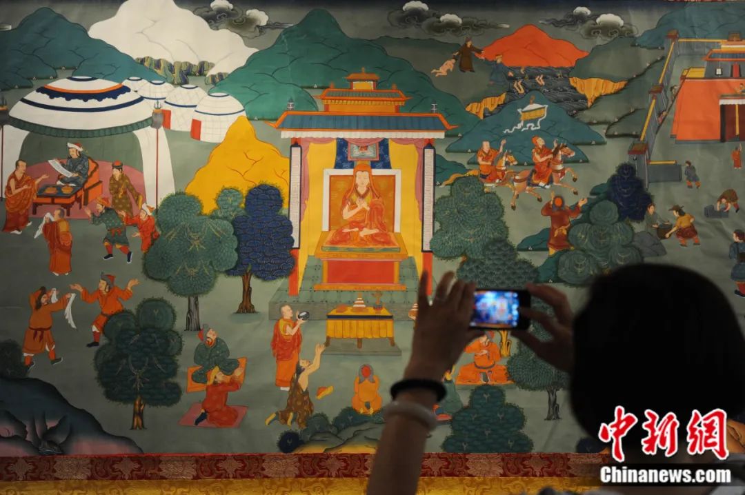 手繪大型歷史題材卷軸唐卡《涼州會盟》。中新社記者 楊艷敏攝