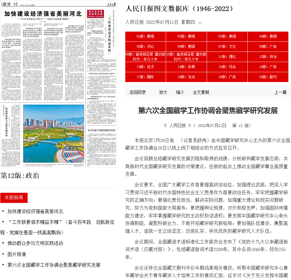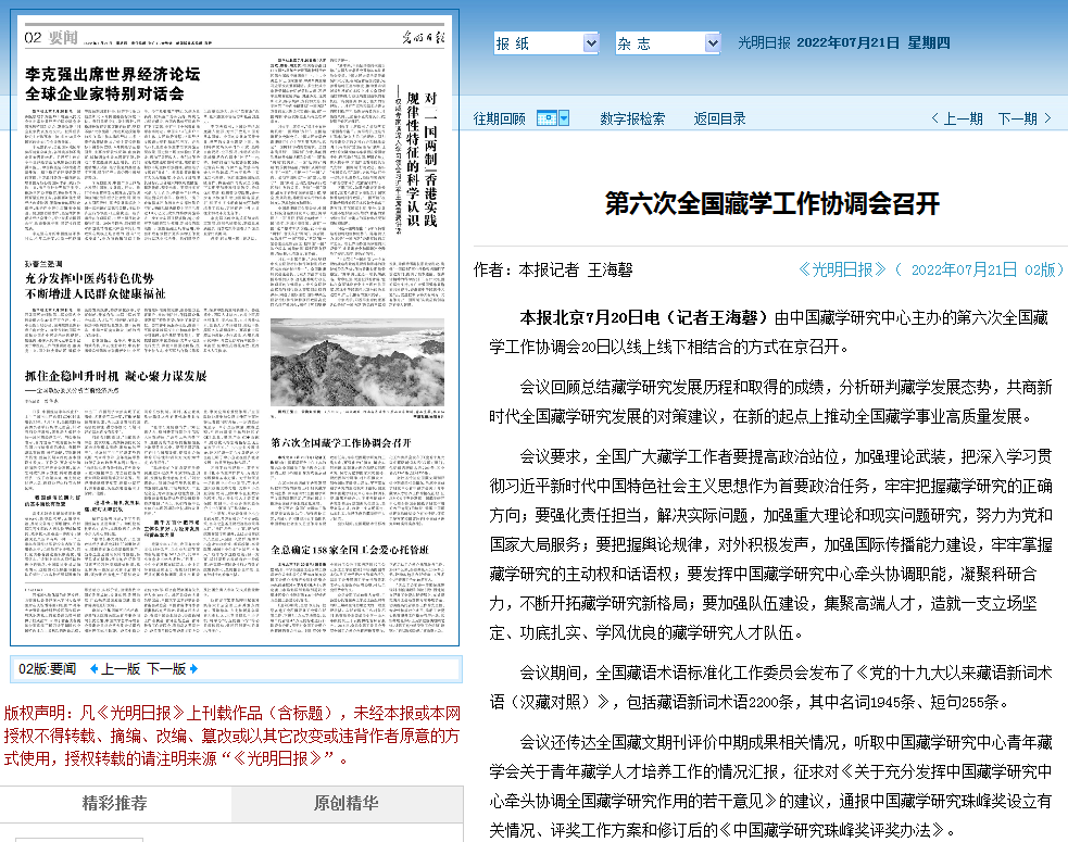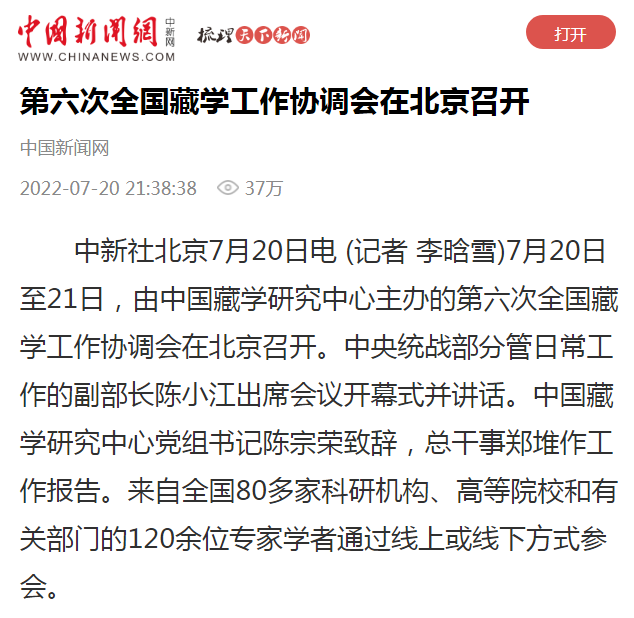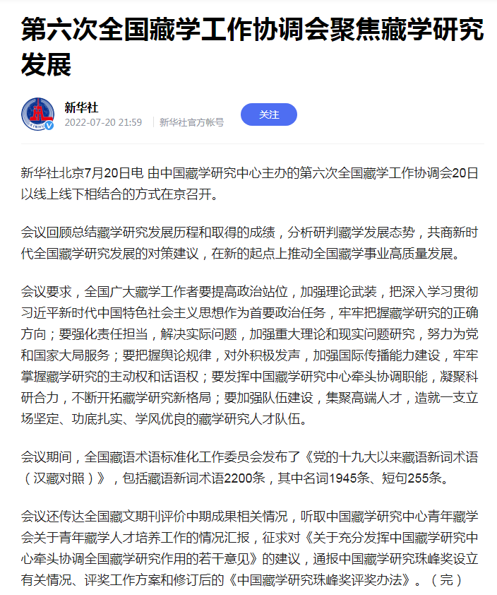 7月20日至21日,第六次全國藏學工作協(xié)調(diào)會在北京召開。近日,人民日報、新華社、中央廣播電視總臺、光明日報、中國日報、中國新聞社等中央主要媒體及所屬新媒體平臺,運用文字、圖片、視頻等多種形式,集中對本次會議情況刊播新聞報道,展現(xiàn)了全國廣大藏學工作者以習近平新時代中國特色社會主義思想為指導,共商新時代藏學研究發(fā)展對策建議、在新的起點上推動全國藏學事業(yè)高質(zhì)量發(fā)展的生動實踐。
