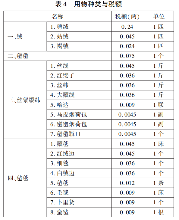 另外,輸出型用物類商貨也十分豐富,包括皮張類、氆氌、氈毯等(詳見表4)。