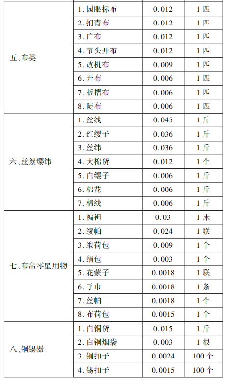 2.用物。從打箭爐用物類別來看,商貨十分豐富,主要包括日常生產(chǎn)生活器具、用具及布帛綢緞(詳見表2)。一部分是作為原材料,與藏地材質(zhì)結(jié)合進行再加工使用,如布帛綢緞與皮毛加工成服飾。一部分是制作好的成品運往打箭爐銷售。