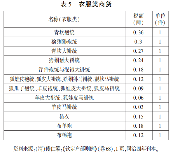 服飾作為人體裝飾的物品總稱,包括衣、帽、鞋、襪等。就清代打箭爐市場流通的服飾及稅則來看,類別多樣,十分豐富(詳見表5)。