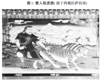 《蒙人馭虎圖》(見圖1)藏語稱“梭波達扯”,表現(xiàn)的是一位蒙古人裝束的勇士,用一條鐵鏈牽著一只猛虎的帶有裝飾性的繪畫作品。蒙古勇士、猛虎、鐵鏈分別象征密教三怙主,即觀音菩薩、文殊菩薩、金剛手菩薩。該裝飾畫借助蒙古勇士、猛虎、鐵鏈形象地表達西藏人民祈求三怙主的護佑,祛災(zāi)納福的愿望。該圖常常繪制于院落門口的照壁上,老虎和蒙古勇士必須面朝門外,表示驅(qū)除一切災(zāi)禍、永絕不祥之意。從這位蒙古勇士的裝束來看,此畫源自元代藝術(shù),是藏族文化和蒙古族文化交流的見證。更為有趣的是,筆者在查找資料時,還發(fā)現(xiàn)了身著清朝馬褂的蒙人馭虎圖(見圖2),從表現(xiàn)形式上看,畫在照壁上、頭朝外的做法,類似于中原文化的門神,表達求吉、趨利、祈福、求生、避害等心理訴求,是對生命、財富、安康與祥瑞的祈愿和關(guān)切,表達了對美好生活的追求,是西藏文化與中原文化相交的見證。