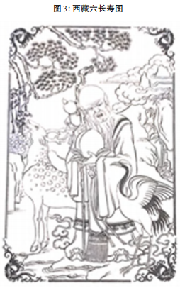 《六長壽圖》是經(jīng)常出現(xiàn)在西藏民居門口的壁畫,具有濃郁的中原文化特色,其象征物源于中原文化(見圖3)。該圖以一位皓發(fā)銀須、面目慈祥的老者為中心,高高的額頭,有著中原文化中壽星仙風(fēng)道骨的質(zhì)感。老者周圍還穿插著車輪、傘蓋、海螺等吉祥八寶,麋鹿和仙鶴嬉戲在林中,山間有曲折隱秘的溪流,呈現(xiàn)出一幅恬靜和美、深邃致遠、融洽無間的仙境圖景,圖中的人、山、河、樹、鳥、獸等造像在藏漢文化中都寓意長壽,從繪畫技法、畫面構(gòu)成、造像特點等方面來看,濃厚的中原文化氣息撲面而來,與《中原壽星圖》(見圖4)有幾分神似。