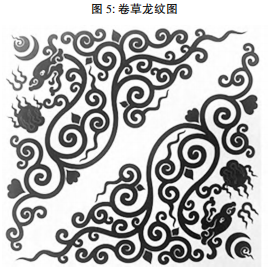 卷草龍紋是中原龍紋傳入西藏后發(fā)生演變的例子(見圖5)。中原龍紋圖案傳入西藏之后,被廣泛使用并引申出許多新的龍紋圖案,該紋樣將龍的造型與卷草結(jié)合起來,巧妙的構(gòu)思和繁縟的造型,為其增添了幾分奢華的韻味,直到今天依然是傳統(tǒng)藝人們喜歡表現(xiàn)的重要題材。裝飾紋樣體現(xiàn)出對漢文化的吸收及對漢文化圖紋藝術(shù)的引進,另外工字紋、回字紋、蝙蝠紋、八卦太極、龍鳳吉祥、五珍八寶、纏枝牡丹、福祿壽喜紋、葫蘆等在壁畫中也被廣泛應(yīng)用。