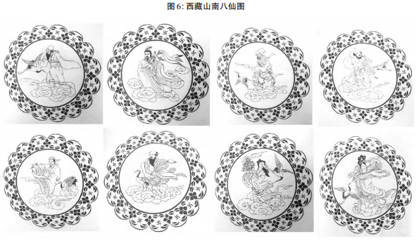 筆者搜集資料時,見到八仙圖案的壁畫——西藏山南八仙圖(見圖6)。整體看,八仙人物面目清晰,姿態(tài)各異,手持法物,生動形象,極具中原文化的特點,但在八仙四周繪制佛教萬字紋樣,也具有西藏地域風(fēng)格。中原的八仙圖的裝飾題材與藏族傳統(tǒng)紋樣自然融合,相得益彰,設(shè)計頗具匠心,為后世研究漢藏文化的交往交流交融提供了具體而生動的實例。這組八仙圖案采用了圓形構(gòu)圖樣式,以圓為美是中原民俗的追求信仰,“圓”代表“圓滿”“完滿”,象征著美滿幸福;在佛教經(jīng)典及習(xí)俗中以圓為美,具有圓滿、圓通等更為豐富的宗教思想內(nèi)涵和宗教美學(xué)象征意義。在歷史上由宗教信仰逐步轉(zhuǎn)化為人們的審美追求,圓的經(jīng)輪、白塔、嘛呢堆等,成為生命、信仰和人生構(gòu)筑的一個個大大小小的圓,體現(xiàn)了藏族人民追求圓滿的精神境界和審美追求。