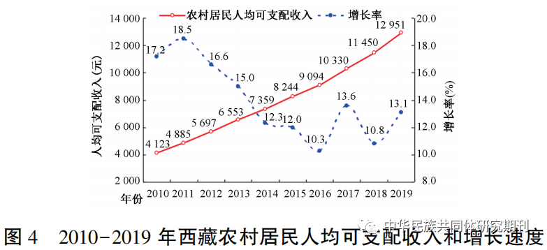 綜上所述,西藏和平解放以來,西藏堅(jiān)持黨的集中統(tǒng)一領(lǐng)導(dǎo)為脫貧攻堅(jiān)的勝利提供了根本保障。消除絕對(duì)貧困工作的有效開展,是更好地穩(wěn)固中華民族共同體物質(zhì)基礎(chǔ)的生動(dòng)實(shí)踐。數(shù)據(jù)顯示,進(jìn)入新世紀(jì),西藏農(nóng)牧民人均可支配收入連續(xù)17年保持兩位數(shù)增長(zhǎng)并突破萬元大關(guān),2019年達(dá)到12951元(見圖4)。
