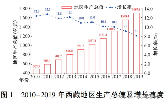 一方面,經(jīng)濟(jì)增長(zhǎng)為推動(dòng)中華民族共同體建設(shè)提供物質(zhì)保障。形塑經(jīng)濟(jì)-利益共同體建設(shè)是中華民族共同體的重要內(nèi)容之一。通過消除絕對(duì)貧困建立經(jīng)濟(jì)-利益共同體,成為了西藏建設(shè)中華民族共同體的重要路徑。改革開放后,西藏工作在中央召開的7次西藏工作座談會(huì)的指引下,形成了不同時(shí)段的工作指導(dǎo)思想,制定了多種特殊優(yōu)惠政策,從資金、人力、技術(shù)等方方面面給予西藏發(fā)展支持,極大解放和發(fā)展了社會(huì)生產(chǎn)力,達(dá)成了經(jīng)濟(jì)-利益共同體的形塑。2010年以來,西藏經(jīng)濟(jì)總量持續(xù)增長(zhǎng)擴(kuò)大(見圖1)。