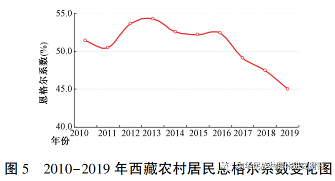 我國(guó)憲法規(guī)定:“國(guó)家建立健全同經(jīng)濟(jì)發(fā)展水平相適應(yīng)的社會(huì)保障制度?!毖怂悸罚鞑卦诮?jīng)濟(jì)增長(zhǎng)的基礎(chǔ)上,全心全意努力實(shí)現(xiàn)社會(huì)事業(yè)的全面進(jìn)步,社會(huì)保障制度得以建立健全,絕對(duì)貧困得以消除,人民群眾的獲得感和幸福感進(jìn)一步增強(qiáng)。建設(shè)基礎(chǔ)和公共服務(wù)設(shè)施對(duì)于提升貧困地區(qū)的教科文衛(wèi)等有巨大推動(dòng)作用,近年來西藏農(nóng)村居民恩格爾系數(shù)不斷下降(見圖5),居民的生活條件有了極大的改善,物質(zhì)條件不斷提高,更能使西藏地區(qū)人民群眾擁護(hù)和支持中華民族共同體建設(shè)。