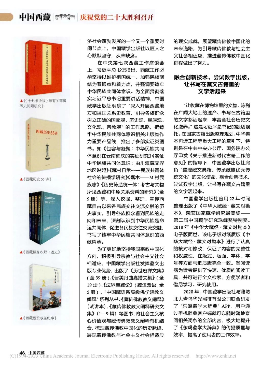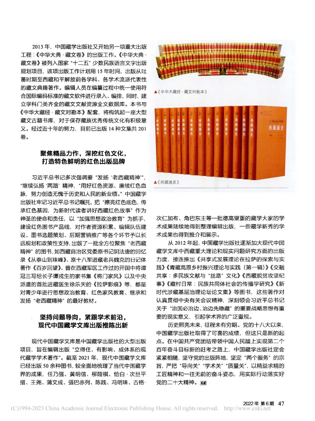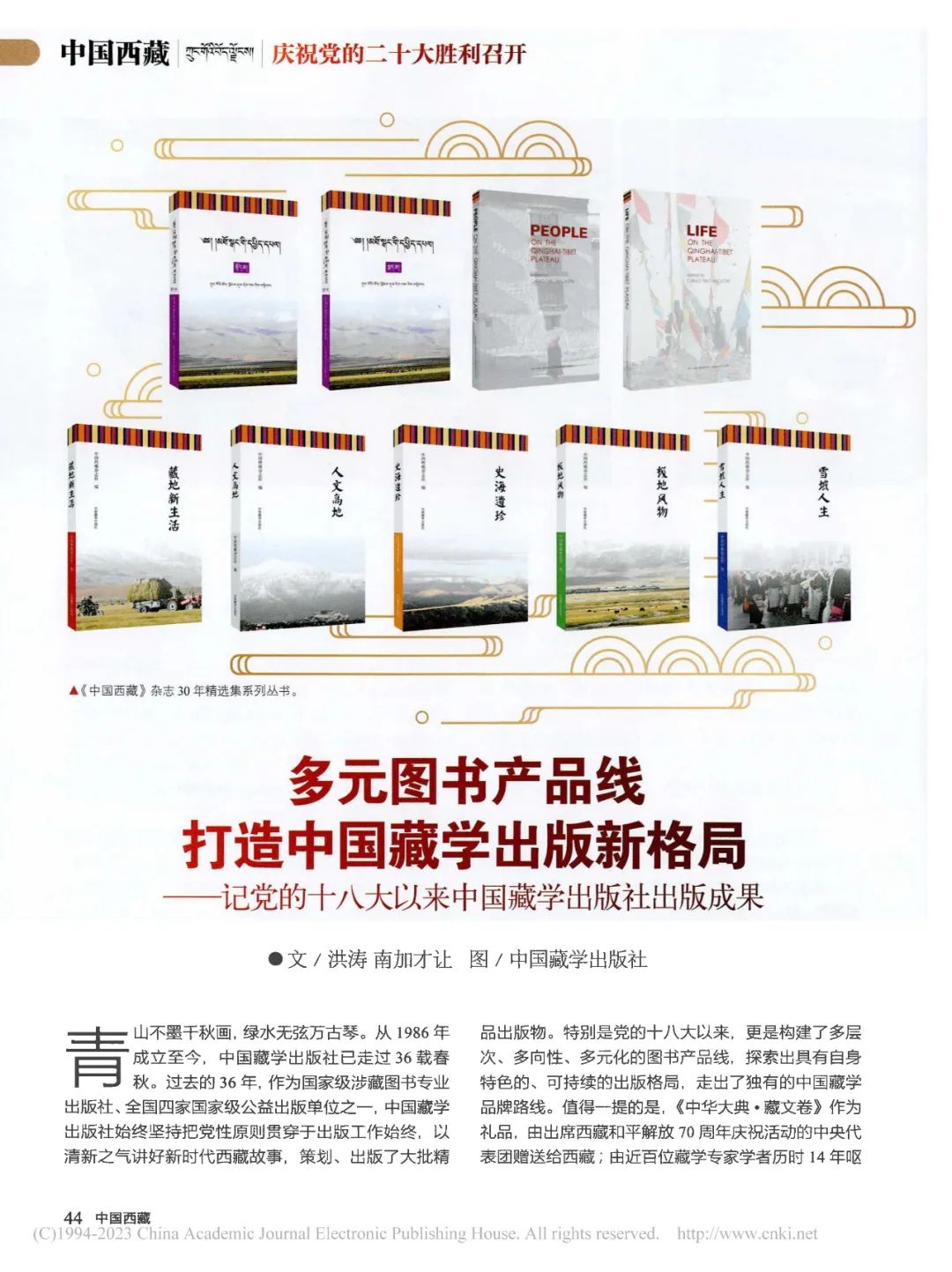 歷史照亮未來,征程未有窮期。黨的十八大以來,中國藏學出版社取得了可喜的成績,但這只是新的起點。在中國共產(chǎn)黨團結(jié)帶領(lǐng)中國人民踏上實現(xiàn)第二個百年奮斗目標新的趕考之路上,中國藏學出版社定會緊緊相隨,堅守黨的出版陣地,堅定“兩個服務(wù)”的宗旨,嚴把“導向關(guān)”“學術(shù)關(guān)”“質(zhì)量關(guān)”,以精益求精的工匠精神和一往無前的奮斗姿態(tài),用實際行動落實好黨的二十大精神。