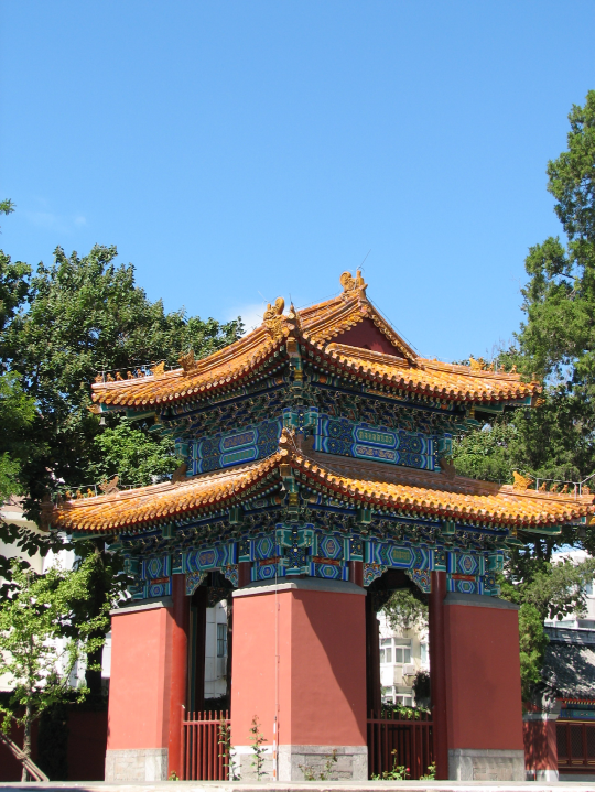 北海北岸曾經(jīng)有一片龐大的藏傳佛教寺廟建筑群,由西北角向東依次是:小西天(又稱“極樂世界”)、萬(wàn)佛樓、闡福寺、大西天經(jīng)廠(又稱“大圓鏡智寶殿”)、西天梵境(又稱“大西天”)。5座建筑中,今天僅有最西邊的小西天和最東邊的大西天還較為完整。萬(wàn)佛樓在動(dòng)亂年代被拆除,只留下一座《萬(wàn)佛樓瞻禮》詩(shī)碑。