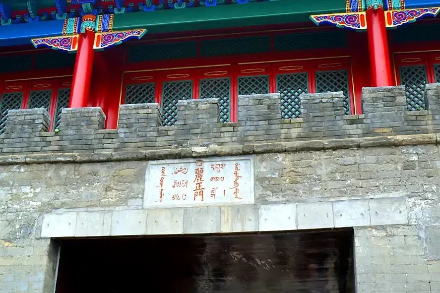 ▲用滿文、蒙古文、漢文、藏文、維吾爾文五種文字鐫刻的“麗正門”。(新華社發(fā))