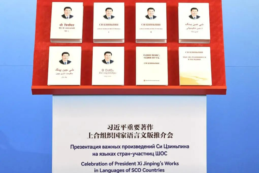 2021年11月17日,習(xí)近平重要著作上合組織國家語言文版推介會在北京舉行。《習(xí)近平談治國理政》第一卷印地文、普什圖文、達(dá)里文、僧伽羅文、烏茲別克文,第二卷烏茲別克文和《之江新語》《習(xí)近平談“一帶一路”》俄文版等8種新書在推介會首發(fā)。新華社記者李賀攝
