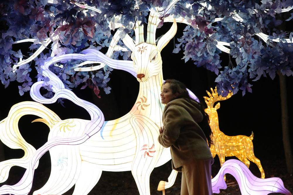 2023年12月14日,一名女子在法國巴黎風(fēng)情園舉辦的“山海有靈”法國豫園燈會上拍照留念。新華社記者高靜攝
