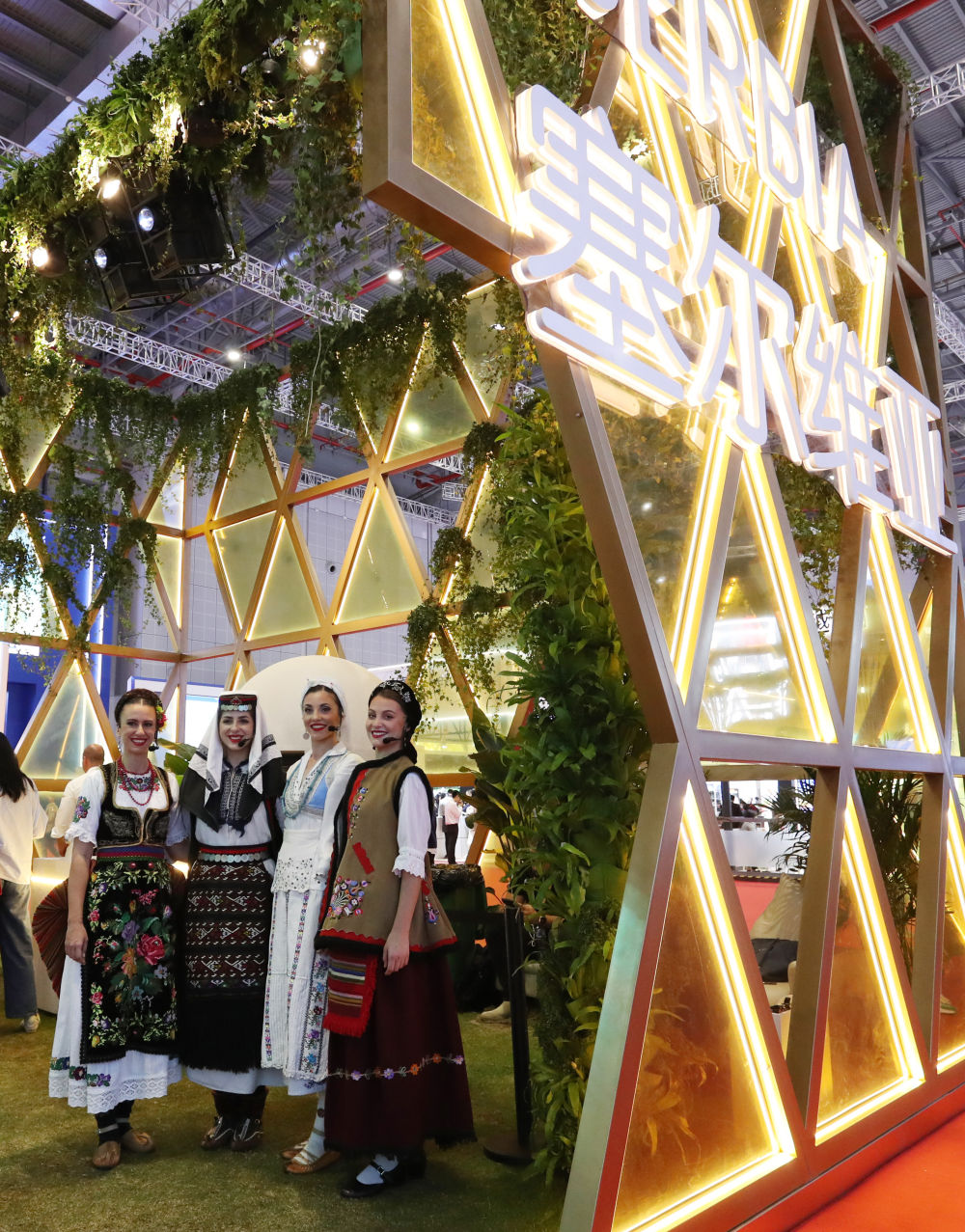 2023年11月6日,身著傳統(tǒng)服飾的演職人員在上海進博會國家展塞爾維亞展臺迎接參觀者。第六屆進博會國家展全面恢復(fù)線下舉辦,洪都拉斯、塞爾維亞、越南、南非、哈薩克斯坦作為本屆進博會主賓國在國家展亮相。新華社記者方喆攝