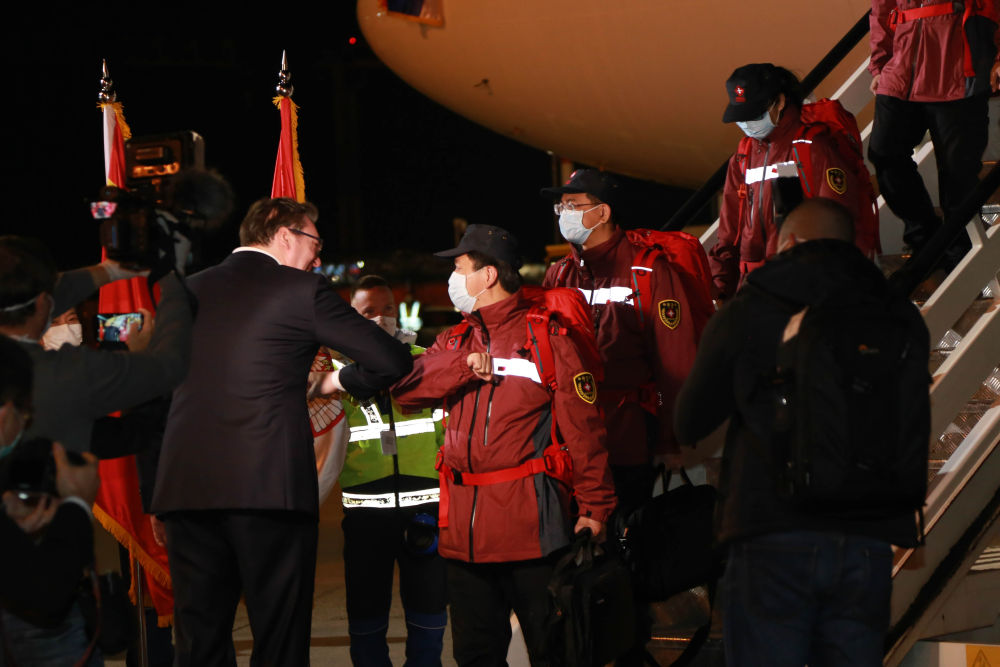 這是2020年3月21日,在塞爾維亞首都貝爾格萊德,前來迎接的塞爾維亞總統(tǒng)武契奇(左)與中國援助塞爾維亞抗疫醫(yī)療專家組成員“碰肘”致意。新華社記者石中玉攝