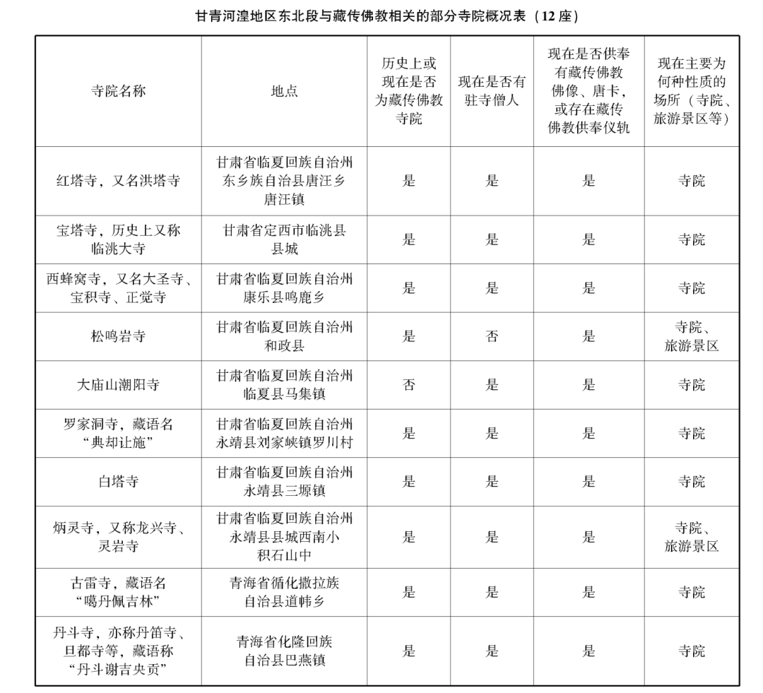 其中甘肅省境內(nèi)有3座:(1)羅家洞寺:據(jù)寺內(nèi)碑刻記載,寺廟始建于明成化二年(1466),清光緒年間重修時,甘南拉卜楞寺四世嘉木樣活佛委派貢唐羅澤法師率工匠雕塑佛像。六世班禪大師、嘉木樣大師、貢唐大師、土觀呼圖克圖、章嘉呼圖克圖等,都曾來此朝禮。據(jù)《續(xù)修導(dǎo)河縣志》載,羅家洞寺“番族往來瞻拜,絡(luò)繹不絕”。羅家洞寺是藏傳佛教格魯派寺廟,屬于拉卜楞寺管轄,現(xiàn)在的活佛是1994年由六世嘉木樣大師認(rèn)定的羅家國師堪布呼畢勒罕四世的轉(zhuǎn)世。寺院現(xiàn)有1位活佛、4位常駐僧人。(2)白塔寺:白塔是寺中的標(biāo)志性建筑,因此周圍的百姓將其稱為“白塔寺”。據(jù)《安多政教史》記載:“自漢地白塔寺以上的區(qū)域,則稱為安多地區(qū)?!贝颂幩f的白塔寺即為此寺。根據(jù)史籍記載,作為唐蕃分界的標(biāo)志,白塔寺至少始建于唐代。民間也有唐朝大將尉遲敬德奉唐皇之命到白塔川監(jiān)督修塔的傳說。元明以來,隨著藏傳佛教的東漸,白塔寺成為藏傳佛教重要寺院之一,現(xiàn)隸屬于拉卜楞寺。1968年,白塔寺因劉家峽水庫蓄水而淹沒,1981年經(jīng)政府批準(zhǔn),按原規(guī)模樣式在原白塔寺以北的塬上,修建了現(xiàn)在的白塔寺。通過調(diào)研了解到,每年農(nóng)歷三月十七日,是傳統(tǒng)的白塔寺龍華善會,永靖、東鄉(xiāng)、臨夏、積石山和鄰省青海民和、循化各地寺院的僧眾及廣大信徒,會在這里舉辦宗教法會。寺院現(xiàn)由夏茸活佛主持,日常事務(wù)由4位居士組成的管委會管理。(3)炳靈寺:炳靈寺以石窟著稱,寺院始建于西秦建弘元年(420),唐代稱為龍興寺,宋代稱為靈巖寺。元初,炳靈寺改宗藏傳佛教薩迦派。元末明初,格魯派傳入炳靈寺。藏傳佛教傳入后,僧俗對原有一些洞窟進(jìn)行了重修再繪,因此一些洞窟既有漢傳又有藏傳佛教的藝術(shù)形式。如第3窟、第168窟、第172窟等,都有明代繪制的藏傳佛教壁畫?!栋捕嗾淌贰酚涊d:“文成公主曾于一個時期居住于其溝腦(炳靈上寺),由她加持,出現(xiàn)瑞兆,有自然顯現(xiàn)的度母像云?!庇终f:“炳靈寺彌勒大佛像據(jù)傳是貢子(孔子之轉(zhuǎn)音)修建?!爆F(xiàn)在炳靈上寺仍為藏傳佛教格魯派寺院,寺院有兩大活佛轉(zhuǎn)世系統(tǒng),即嘉楊隆主活佛轉(zhuǎn)世系統(tǒng)和嘉楊沃色活佛轉(zhuǎn)世系統(tǒng),其轉(zhuǎn)世活佛中有的來自涉藏地區(qū),有的來自漢地。炳靈寺現(xiàn)為永靖縣重點(diǎn)開發(fā)的景點(diǎn),游人可從劉家峽大壩沿庫區(qū)溯流而上,或乘車從陸路到達(dá)。