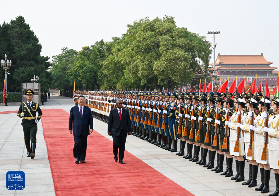 會談前,習近平和夫人彭麗媛在人民大會堂東門外廣場為恩巴洛和夫人迪尼西婭舉行歡迎儀式。