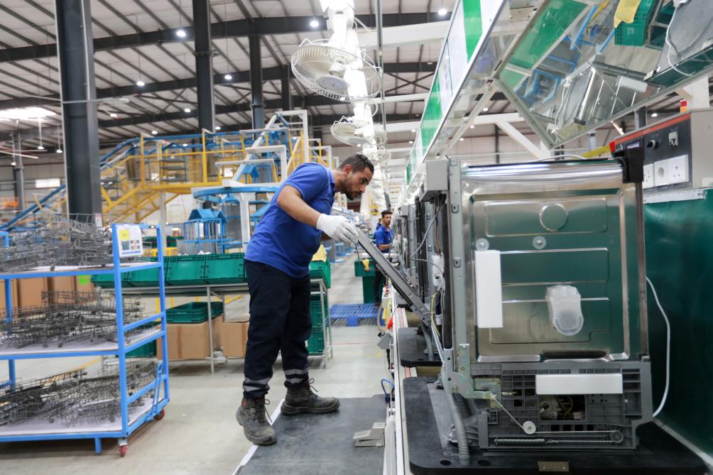 2023年8月10日,在埃及蘇伊士省的中埃·泰達(dá)蘇伊士經(jīng)貿(mào)合作區(qū),員工在工廠生產(chǎn)線上工作。新華社記者隋先凱攝