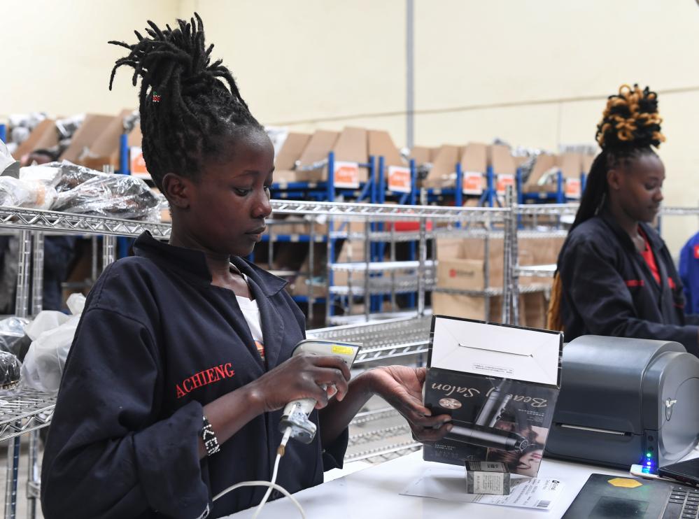 2023年11月10日,在肯尼亞姆洛隆戈,Kilimall員工在倉庫內(nèi)工作。Kilimall是第一家在非洲設(shè)立海外倉并實(shí)現(xiàn)100%在線支付的中國電商平臺,是當(dāng)?shù)孛癖娤矏鄣馁徫锞W(wǎng)站之一。新華社記者李亞輝攝