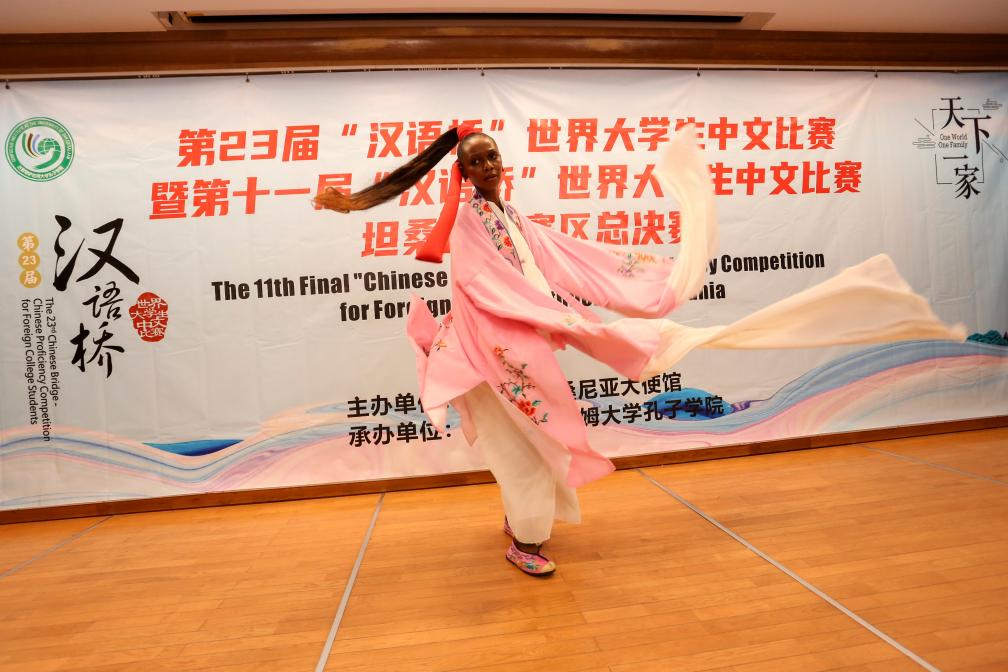 2024年5月22日,在坦桑尼亞達(dá)累斯薩拉姆,參賽者在“漢語橋”世界大學(xué)生中文比賽坦桑尼亞賽區(qū)決賽上展示才藝。新華社發(fā)(赫爾曼·埃馬紐埃爾攝)