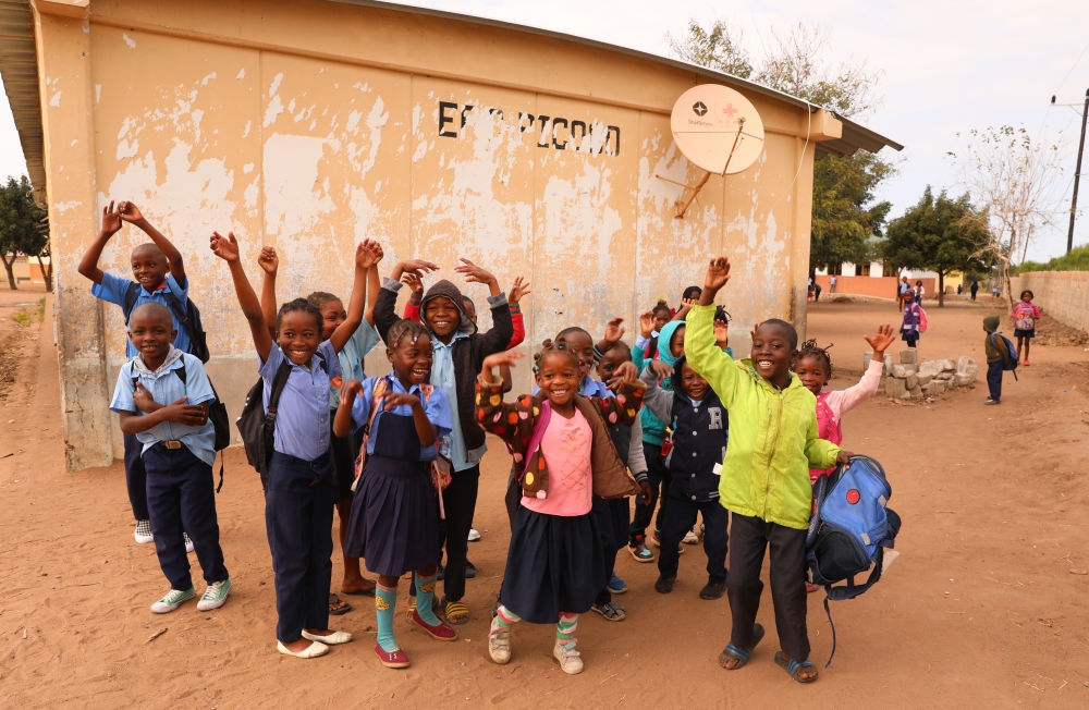 2023年7月25日,莫桑比克馬普托省皮科科村學(xué)校的孩子們站在裝有中國援助的衛(wèi)星電視接收天線的房屋前?!叭f村通”項目旨在為非洲國家的1萬個村莊接入衛(wèi)星數(shù)字電視信號,項目2018年在莫桑比克啟動,為該國1000個村落、2萬戶家庭和3000個公共場所安裝衛(wèi)星電視設(shè)備,提供電視信號和節(jié)目,覆蓋農(nóng)村人口達(dá)250萬。新華社記者董江輝攝
