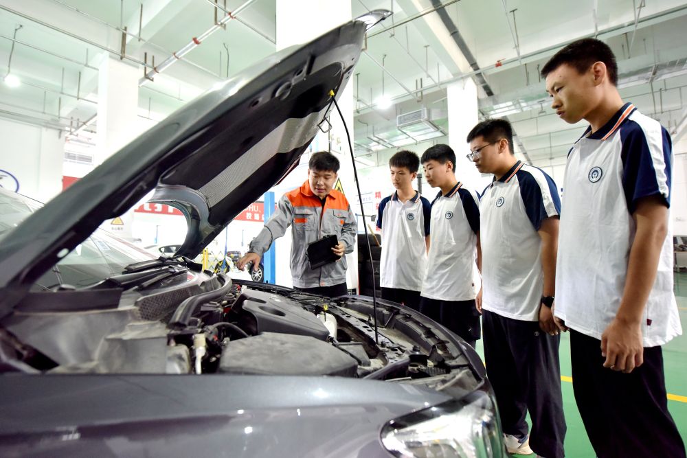 2024年6月7日,河北省邢臺市威縣職業(yè)技術(shù)教育中心教師在指導(dǎo)學(xué)生學(xué)習(xí)汽車維修技術(shù)。新華社記者王曉攝